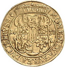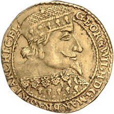 Los-Nummer: Auktion 51 - 333 Altdeutsche Münzen und Medaillen Brandenburg-Preußen Georg Wilhelm 1619-1640, Dukat 1638, Königsberg. Münzmeister David Koch. Bärtiges Brustbild mit Kurhut und mit besticktem Mantel nach rechts / Unter Kurhut vierfeldiges Wappen mit aufgelegtem Zepterschild zwischen geteilter Jahreszahl und Münzmeisterzeichen. Am Ende der Umschrift Wardeinzeichen des Ernst Pfaler. Olding 8 a, Slg. Marienburg 1530, Friedberg 2185. #02183} GOLD. Sehr schön + Schätzpreis: 2000,- Zuschlag: 3400,- |