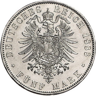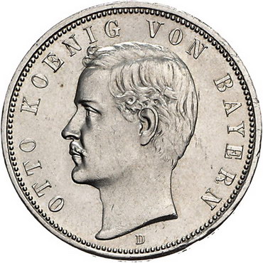 Los-Nummer: Auktion 51 - 2590 Münzen des Deutschen Kaiserreichs Bayern Otto 1886-1913, 5 Mark 1888 D. Jaeger 44. Kleine Randfehler, vorzüglich + Schätzpreis: 900,- Zuschlag: 720,- |