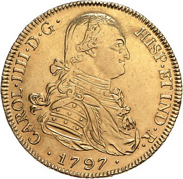 Los-Nummer: Auktion 51 - 2913 Ausländische Münzen und Medaillen Bolivien Carlos IV. 1788-1808, 8 Escudos 1797 PP, Potosi. Calicó/Trigo 91, Friedberg 14. GOLD. Vorzüglich / vorzüglich + Schätzpreis: 1500,- Zuschlag: unverkauft |